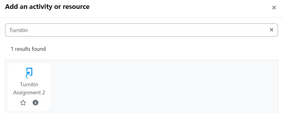Step 4 : Key in "Turnitin" in the search box and the Turnitin Assignment 2 will be displayed. Click on the icon and the Adding a new Activity page will open.