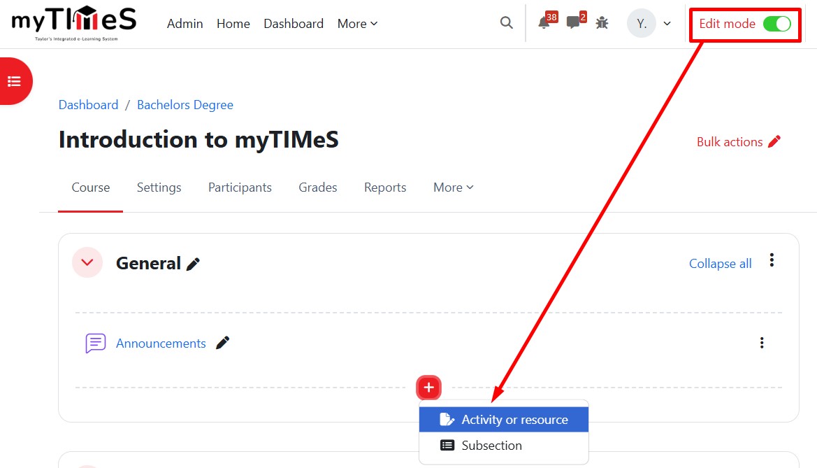 Step 1 : Toggle on the "Edit mode" at the top right of your module page.
