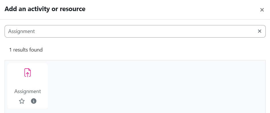 Step 4 : Key in "Assignment" in the search box and the Assignment activity will be displayed. Click on the Assignment icon and the Adding a new Activity page will open.