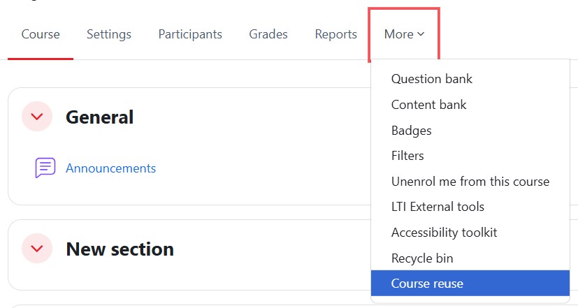 Step 2 : At the module navigation, click on "More" select "Course reuse".