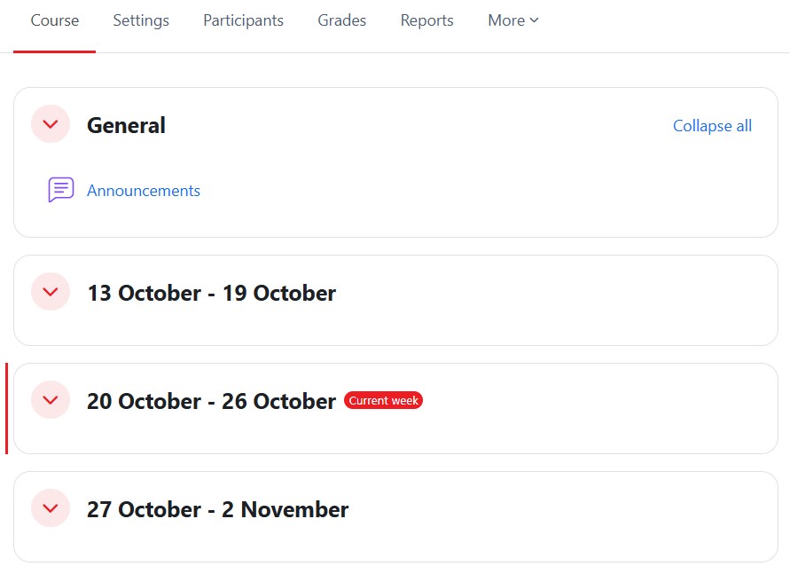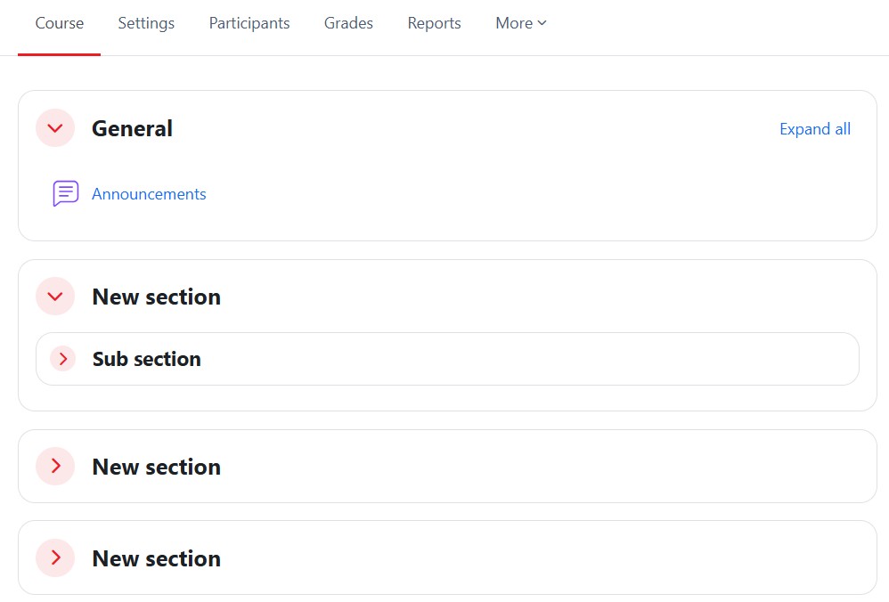 Custom sections usually refer to sections (or “topics”) that lecturers can add, rename, move, or format to organize course content in a way that suits their teaching style. These sections can also be made collapsible, allowing students to expand or collapse topics for easier navigation and a cleaner course layout. In addition, lecturers can now add subsections within a section, providing an extra level of organization for structuring complex modules or grouping related activities and resources.