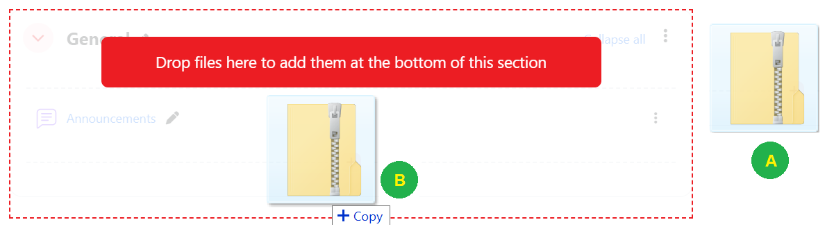 Step 3 : Zip the folder then click and hold the zip file (A) from File Explorer, drag it to your chosen section (B), and release.
