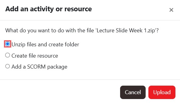 Step 4 : A pop-up window will appear asking what you want to do with the ZIP file. Select "Unzip files and create folder" and click "Upload". The folder will be automatically created on your module page, containing all the extracted files from the ZIP package.