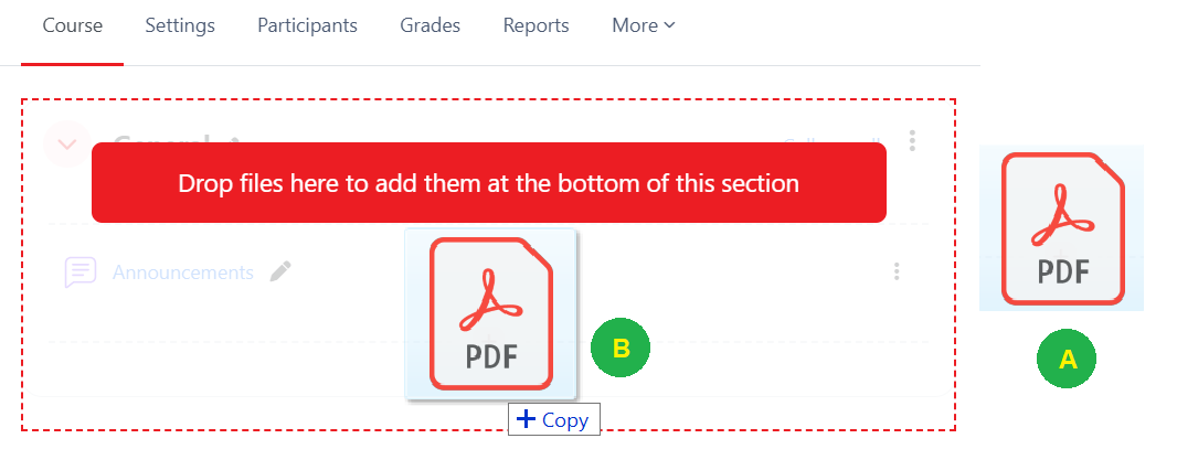 Step 3 : Click and hold the file (A) from File Explorer, drag it to your chosen section (B), and release. The file will be uploaded and appear on the module homepage.