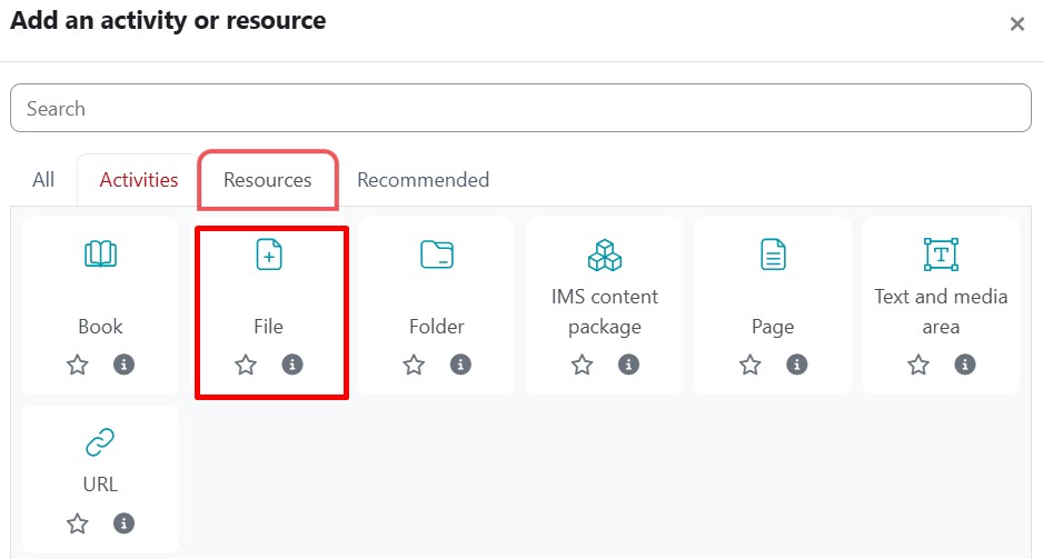Step 4 : Go to the Resources tab and click the File icon. The Adding a new File page will open.
