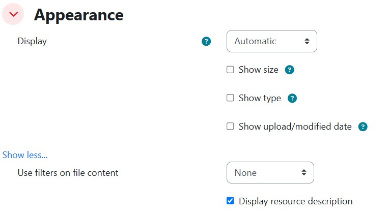 Step 7 : Expand the Appearance settings to select, for example, whether to show students its size, type and date uploaded and how you want the file to display. Use the help icon for more information.