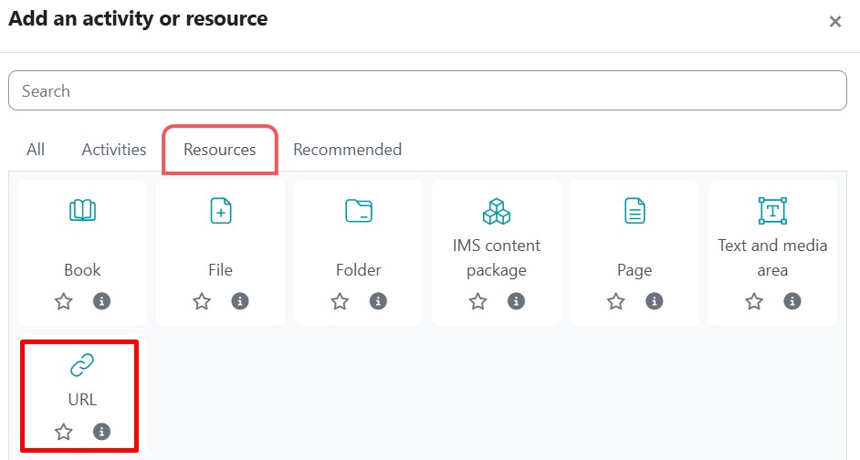 Step 4 : Go to the Resources tab and click the URL icon. The Adding a new URL page will open.